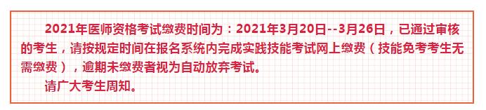 2021年醫(yī)師資格考試?yán)U費(fèi)時(shí)間為:2021年3月20日--3月26日,已通過(guò)審核的考生,請(qǐng)按規(guī)定時(shí)間在報(bào)名系統(tǒng)內(nèi)完成實(shí)踐技能考試網(wǎng)上繳費(fèi)(技能免考考生無(wú)需繳費(fèi)),逾期未繳費(fèi)者視為自動(dòng)放棄考試。