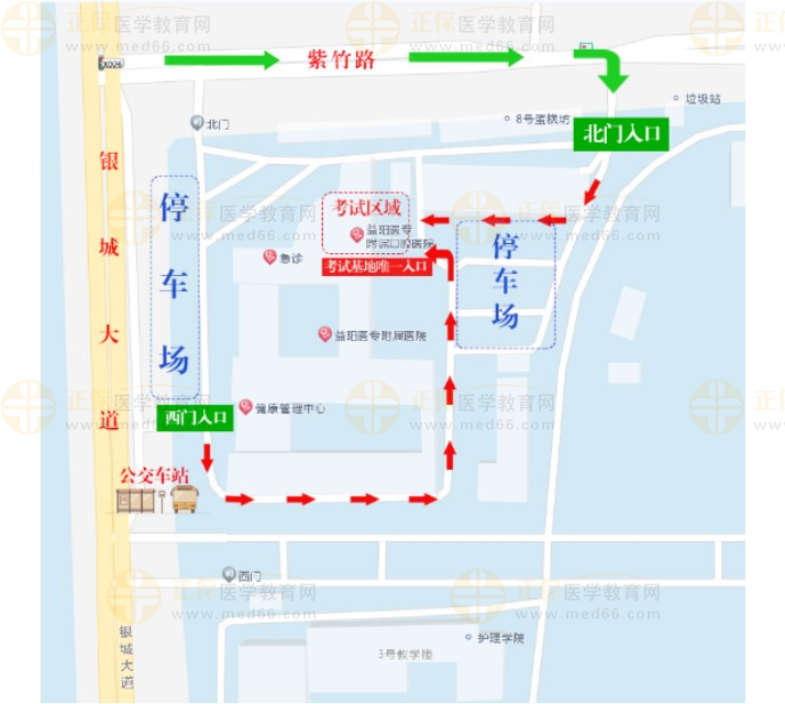 (一)口腔實踐技能考試基地設(shè)在益陽醫(yī)學(xué)高等??茖W(xué)校附屬口腔醫(yī)院(銀城大道與紫竹路交匯處),考生可坐3、28、108路公交車、益寧城際98路、309魚形山、307龍嶺專線到達益陽醫(yī)專(西門)??忌胶笳埌粗敢穆肪€從醫(yī)院西門或北門進入基地(西北門因維護臨時封閉),考生考試的工作服由基地統(tǒng)一提供,在一樓完成存包、換領(lǐng)工作服、安檢后,按指引路線到五樓總候考室候考,再按規(guī)定流程完成考試。