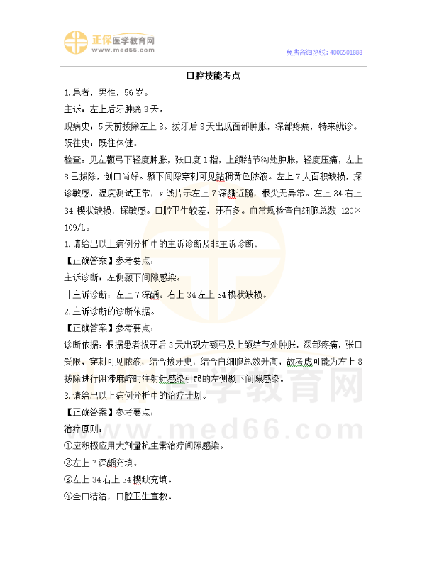 從考后反饋的考查內(nèi)容來看:第四、五站病史采集和病例分析在網(wǎng)校的課程中均出現(xiàn)過,基本屬于均勻分布,比如第四站病史采集中常規(guī)的牙痛、牙松動(dòng)、牙齦腫痛、頜面部腫痛、口腔黏膜潰瘍、修復(fù)后疼痛等。第五站病例分析中齲病、牙髓病、根尖周炎、牙齦炎、牙周炎、智齒冠周炎、間隙感染、牙周膿腫、口腔潰瘍、牙體缺損,牙列缺損、牙列缺失等均有所涉及。第一站特殊檢查、第二站技能操作中也全部都是大綱要求的內(nèi)容。但是今年在操作要求上更加嚴(yán)格,各個(gè)操作細(xì)節(jié)點(diǎn)考查的比較多,這里小編也是給大家整理了體格檢查和技能操作上的一些小要點(diǎn):