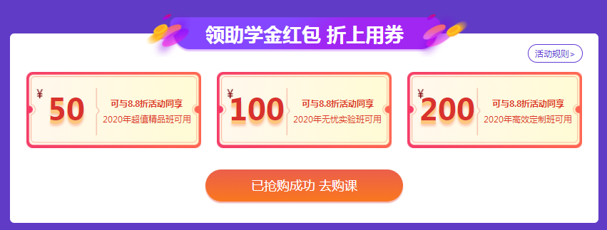 2020年1月8日-2020年2月3日期間用戶可來頁面免費領(lǐng)取學(xué)費紅包(活動期間內(nèi)用戶僅限領(lǐng)取一次),學(xué)費紅包內(nèi)含50元、100元、200元優(yōu)惠券,使用規(guī)則如下: