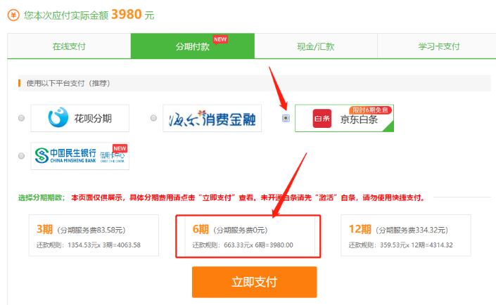 第四步:在支付頁面,選擇分期付款-京東白條進行支付,分期期數(shù)一定要選擇6期哦!