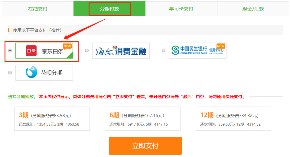 第三步:在支付頁面,選擇分期付款-京東白條進(jìn)行支付哦!