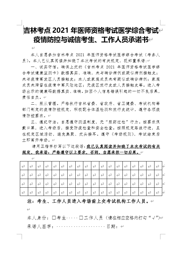 為有效應(yīng)對當(dāng)前新冠疫情的風(fēng)險挑戰(zhàn),保障廣大考生和考試工作人員的生命安全和身體健康,保障吉林考點2021年醫(yī)師資格考試醫(yī)學(xué)綜合考試安全有序進(jìn)行,按照吉林考點疫情防控工作要求,現(xiàn)將參加考試的考生及考試工作人員需要填報健康監(jiān)測卡和承諾書等有關(guān)事項公告如下: