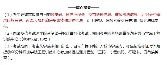 七、醫(yī)師資格考試醫(yī)學(xué)綜合筆試采取計(jì)算機(jī)化考試,益陽考點(diǎn)的考場設(shè)置在湖南城市學(xué)院工程訓(xùn)練中心(迎賓東路518號(hào)),考試期間,考生從學(xué)院南校門進(jìn)出,自帶車輛不能進(jìn)入城市學(xué)院內(nèi)??忌礈?zhǔn)考證時(shí)間段提前60分鐘抵達(dá)學(xué)院工程訓(xùn)練中心參加體溫檢測(cè)并查驗(yàn)“三碼”(健康碼、行程卡、疫苗接種碼)。