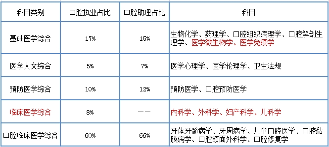 注:表格中紅色部分,非口腔執(zhí)業(yè)助理醫(yī)師資格考試科目。