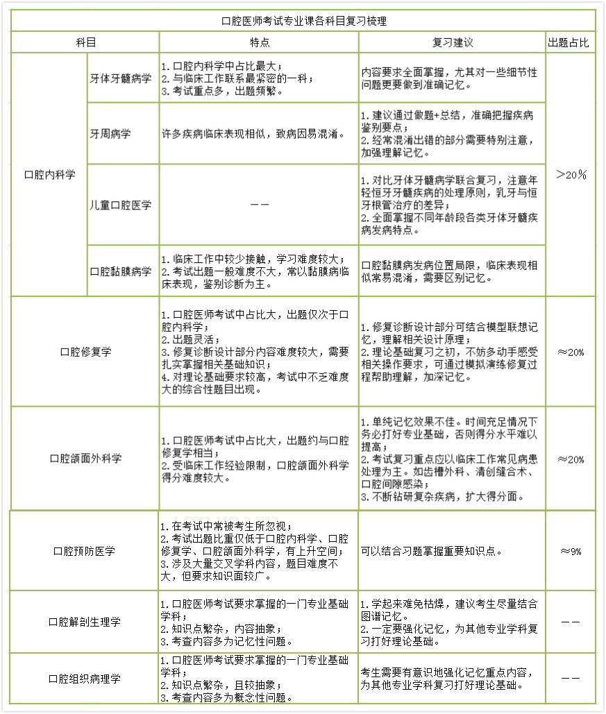 得專業(yè)者得天下。口腔醫(yī)師資格考試中專業(yè)課程一共包括口腔組織病理學(xué),口腔解剖生理學(xué)、口腔預(yù)防醫(yī)學(xué)、口腔內(nèi)科學(xué),口腔頜面外科學(xué)和口腔修復(fù)學(xué)六大門課程。其中口腔內(nèi)科學(xué)又包括了牙體牙髓病學(xué)、牙周病學(xué)、兒童口腔醫(yī)學(xué)和口腔黏膜病學(xué)四門課程。各專業(yè)課程的復(fù)習(xí)特點(diǎn)、復(fù)習(xí)建議及考試占比見下表。