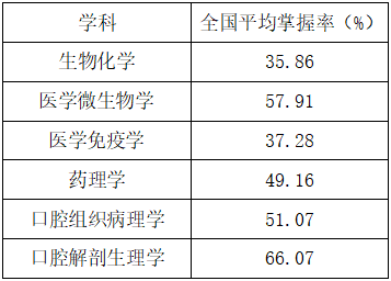 有12門課程的全國平均掌握率高于60%,說明這些科目大家都掌握的比較好,有6門全國平均掌握率在50-60%之間,說明這些科目難度也不是很大,還是有提升的空間,而生物化學、醫(yī)學免疫學、藥理學、內(nèi)科學相對比較難,考試正確率較低。其中,口腔專業(yè)科目中,兒童口腔醫(yī)學和口腔修復學全國平均掌握率占到56.13%和58.26%,說明這兩個科目考生相對正確率較低。但是,通過網(wǎng)校分析發(fā)現(xiàn),兒童口腔醫(yī)學題目并不是很難,所以這個科目的題目一定要多多練習,這個科目的正確率是可以提升的。而口腔修復學近幾年確實公認屬于較難的一個科目,不僅是病例題干變長,而且與臨床內(nèi)容聯(lián)系較緊密,考察考生的臨床思辨能力較強,故需要網(wǎng)校學員跟著老師的課程認真學習,在牢固掌握理論內(nèi)容的基礎(chǔ)上,鍛煉自己的臨床思辨能力,并且考前模擬練習的時候,注意鍛煉自己的做題速度。相信通過老師的分析與指導,再加上考生認真充分的準備,一定能順利通過考試。
