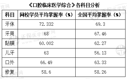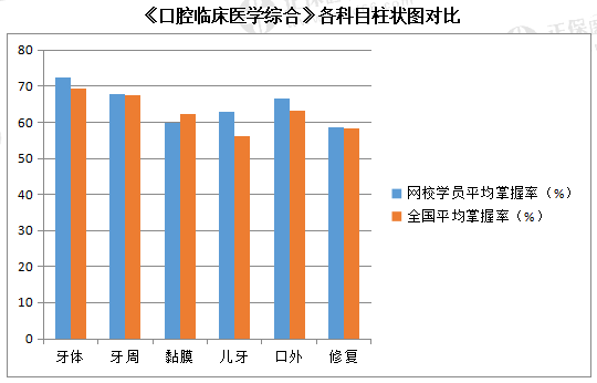 (2)《口腔臨床醫(yī)學(xué)綜合》這個模塊,屬于考試的重中之重,也是考試所占分值最大的一個模塊。根據(jù)網(wǎng)校學(xué)員各科目掌握率進行分析,除口腔黏膜學(xué)員個人掌握率<全國平均掌握率,口腔修復(fù)學(xué)個人掌握率≈全國平均掌握率外,其余幾個科目學(xué)員個人掌握率均>全國掌握率。尤其是兒童口腔醫(yī)學(xué),雖然全國平均掌握率偏低,但是網(wǎng)校學(xué)員此科目個人掌握率要明顯高于全國平均掌握率,說明網(wǎng)校學(xué)員對于這門課程的掌握還是比較牢固的。另外要具體分析一下口腔黏膜病學(xué)。該科目學(xué)員平均掌握率低于全國平均掌握率,這種情況的出現(xiàn),說明網(wǎng)校學(xué)員對此科目的掌握,存在一定的差距。因此在以后的學(xué)習(xí)中,網(wǎng)校會將課程內(nèi)容講解的更加細致,知識點涉及的更加廣泛,另外學(xué)員要更加強題目的練習(xí),爭取在這個科目中掌握的更加牢固。