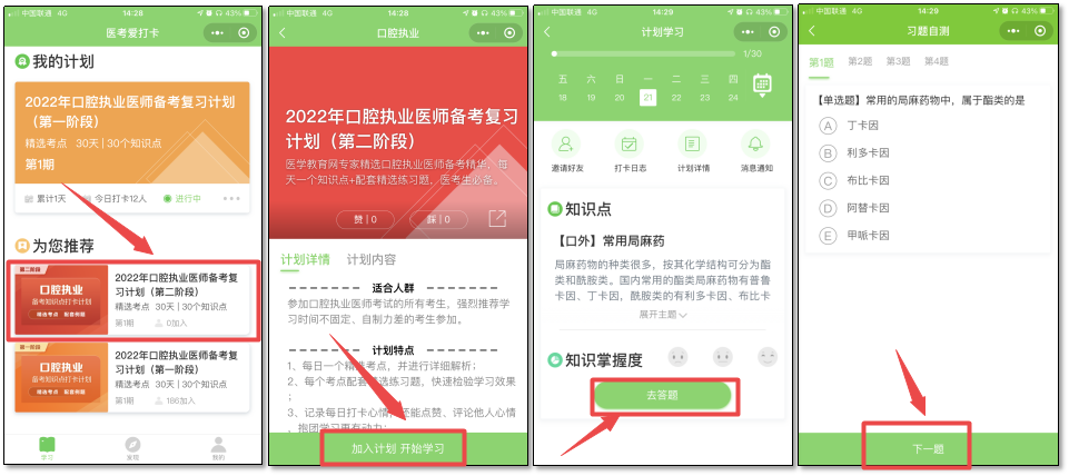 第三步:選擇備考科目后即進(jìn)入學(xué)習(xí)計劃選擇的頁面,請選擇“您的備考計劃”,如口腔執(zhí)業(yè)醫(yī)師備考復(fù)習(xí)計劃(第二階段),然后點擊下方“加入計劃 開始學(xué)習(xí)”按鈕,開始正式進(jìn)入打卡學(xué)習(xí)。