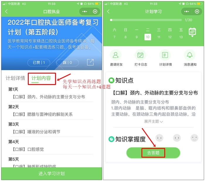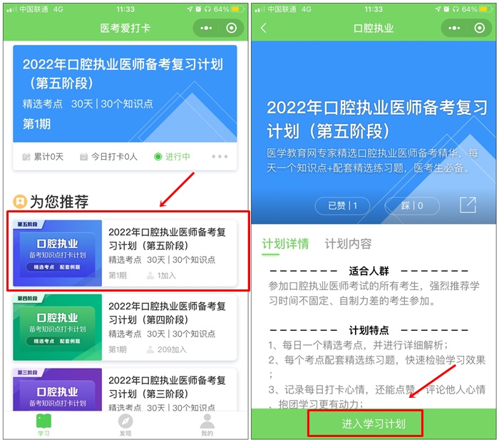 如口腔執(zhí)業(yè)醫(yī)師備考復(fù)習(xí)計(jì)劃(第五階段),然后點(diǎn)擊下方“加入計(jì)劃 開始學(xué)習(xí)”按鈕,開始正式進(jìn)入打卡學(xué)習(xí)。