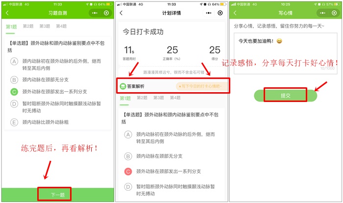 (3)查看測(cè)試結(jié)果+答案解析+分享今日打卡心情,提交完成打卡