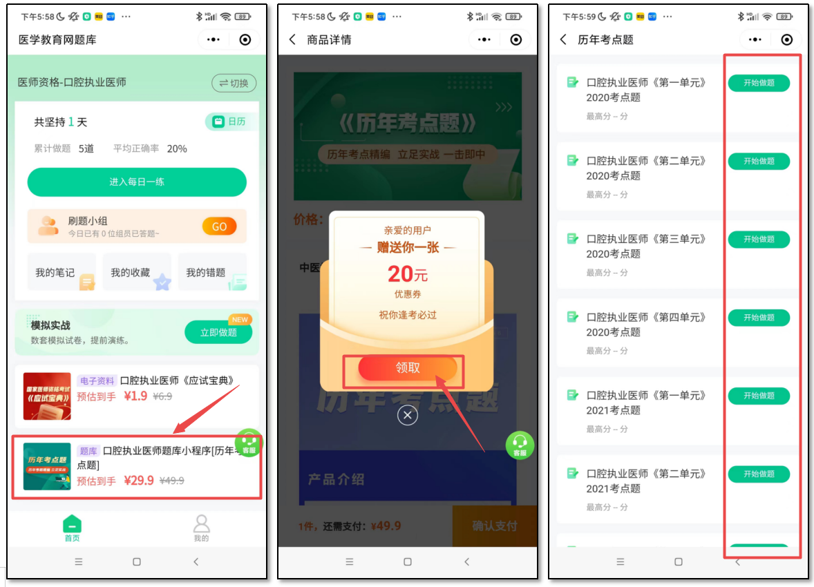 2、選擇“口腔執(zhí)業(yè)醫(yī)師”,下滑到底部選擇“口腔執(zhí)業(yè)醫(yī)師題庫小程序[歷年考點(diǎn)題]”,到手價(jià)僅需29.9元!