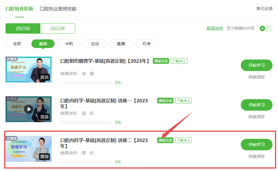 2023年醫(yī)師備考全面開啟!2023年口腔執(zhí)業(yè)醫(yī)師基礎學習新課開通!目前由雪松老師授課的《口腔內科學》科目課程已更新完畢!已購課同學可以直接進入我的網校我的家-我的課程-口腔內科學科目進行學習!2023年口腔執(zhí)業(yè)醫(yī)師《口腔內科學》考試大綱/教材與2022年相比無變動,具體內容下方查看。未購課學員點擊此處進入選擇課程>,具體看課位置如下: