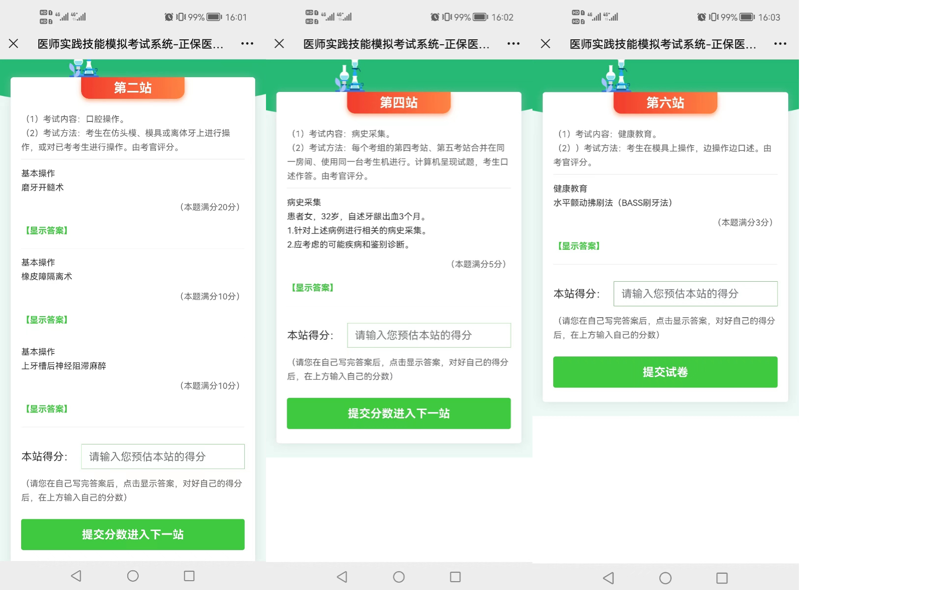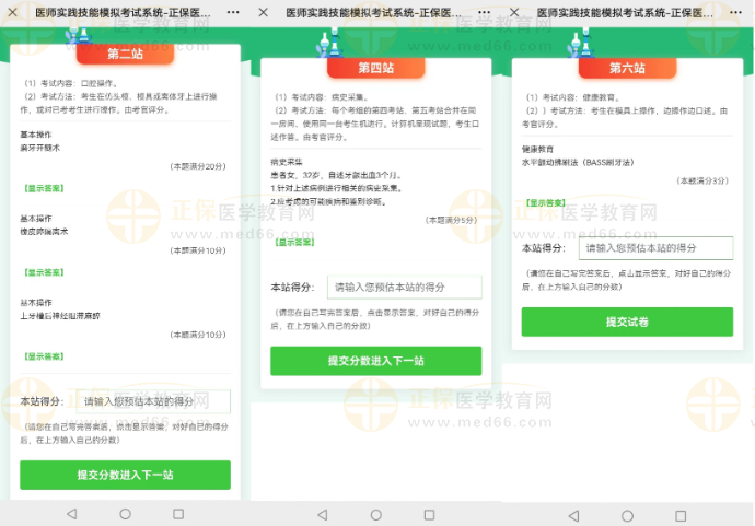 第一站試題做完后填寫(xiě)預(yù)估的分?jǐn)?shù)就會(huì)進(jìn)入第二站的試題,以此類推,六站都完成練習(xí)后會(huì)生成考試成績(jī)!口腔執(zhí)業(yè)醫(yī)師總共有3套試題供練習(xí)!