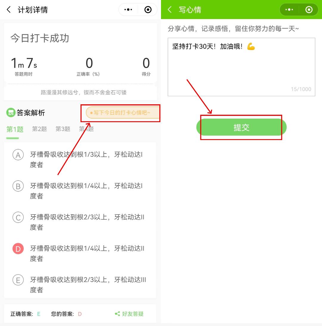 做完題后,可以查看每道題的解析和整體做題情況,然后點(diǎn)擊“分享今日打卡心情”,輸入您要記錄的內(nèi)容,提交即可完成打卡。