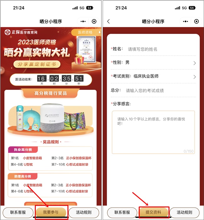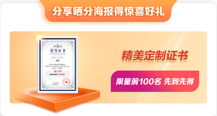 您可在醫(yī)考成績單小程序參與曬分后將生成的曬分海報分享到朋友圈、小紅書、微博等平臺,然后將在其他平臺曬分的截圖提交到下方的問卷中,網(wǎng)校將按照提交順序,選取前100名進行榮譽證書的發(fā)放。
