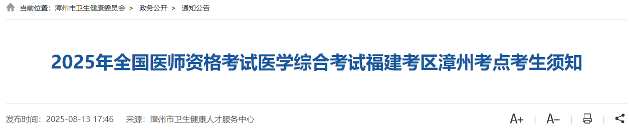 官方速報(bào):福建漳州2025年醫(yī)師資格綜合筆試考生須知,包含準(zhǔn)考證打印時(shí)間以及考生注意事項(xiàng),請(qǐng)相關(guān)考生及時(shí)查看,做好應(yīng)試準(zhǔn)備!