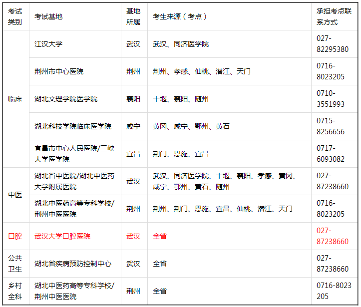2020年口腔執(zhí)業(yè)醫(yī)師實(shí)踐技能湖北考區(qū)考試基地及考點(diǎn)聯(lián)系方式