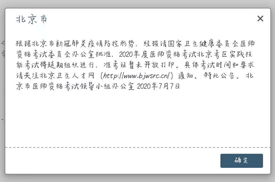 根據(jù)北京市新冠肺炎疫情防控形勢(shì),經(jīng)報(bào)請(qǐng)國(guó)家衛(wèi)生健康委員會(huì)醫(yī)師資格考試委員會(huì)辦公室批準(zhǔn),2020年度醫(yī)師資格考試北京考區(qū)實(shí)踐技能考試將延期組織進(jìn)行,準(zhǔn)考證暫未開(kāi)放打印。具體考試時(shí)間和要求請(qǐng)關(guān)注北京衛(wèi)生人才網(wǎng)(http://www.bjwsrc.cn/)通知。特此公告。