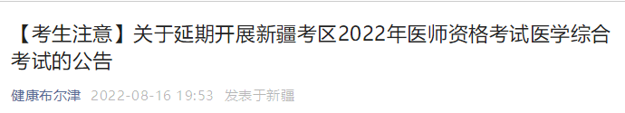 為切實做好我區(qū)新冠肺炎疫情防控工作,確保廣大考生和考試工作人員的生命安全和身體健康,新疆考區(qū)決定延期開展原定于8月19日至21日的2022年醫(yī)師資格考試醫(yī)學(xué)綜合考試,具體時間另行通知。