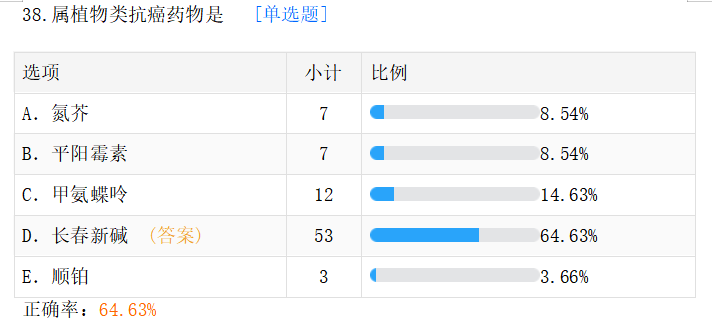 屬植物類抗癌藥物是什么?此次口腔醫(yī)師模考正確率為64.63%。各位考生經(jīng)過了春節(jié)假期短暫的放松,現(xiàn)階段應該收心復習了,醫(yī)學教育網(wǎng)為您精心挑選了50道模擬測試題,快來測測你的水平吧!立即免費參與>>