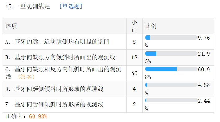 作為2022年口腔醫(yī)師的重要知識(shí)點(diǎn)—一型觀測(cè)線,此次口腔醫(yī)師???strong>正確率為60.98%。各位考生經(jīng)過(guò)了緊張的報(bào)名審核,現(xiàn)階段應(yīng)該收心復(fù)習(xí)了,醫(yī)學(xué)教育網(wǎng)為您精心挑選了50道模擬測(cè)試題,快來(lái)測(cè)測(cè)你的水平吧!立即免費(fèi)參與>>