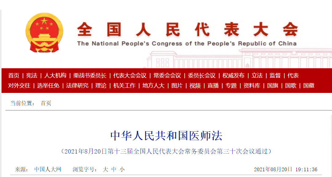 《中華人民共和國醫(yī)師法》于2021年8月20日第十三屆全國人民代表大會常務(wù)委員會第三十次會議通過,以下簡稱《醫(yī)師法》。本法自2022年3月1日起施行?!吨腥A人民共和國執(zhí)業(yè)醫(yī)師法》同時廢止。