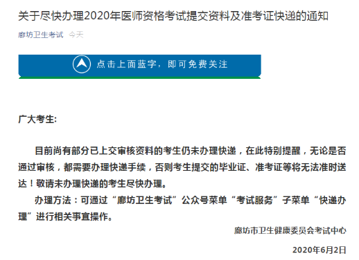 2020廊坊市關(guān)于口腔執(zhí)業(yè)醫(yī)師資格考試快遞手續(xù)盡快辦理的通知