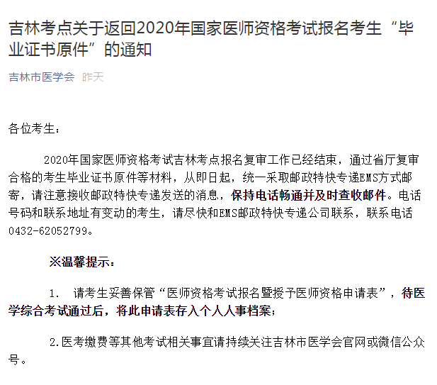 吉林市2020年口腔執(zhí)業(yè)醫(yī)師資格報(bào)名材料原件統(tǒng)一郵寄返回的通知