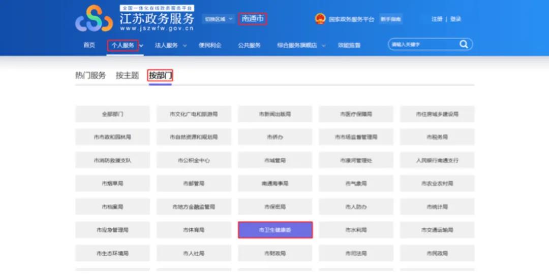 登錄江蘇省政務(wù)服務(wù)網(wǎng)(http://www.jszwfw.gov.cn/),切換區(qū)域至“南通市”,點(diǎn)擊“個(gè)人服務(wù)”欄目,選擇“按部門”顯示,點(diǎn)擊“市衛(wèi)生健康委”。