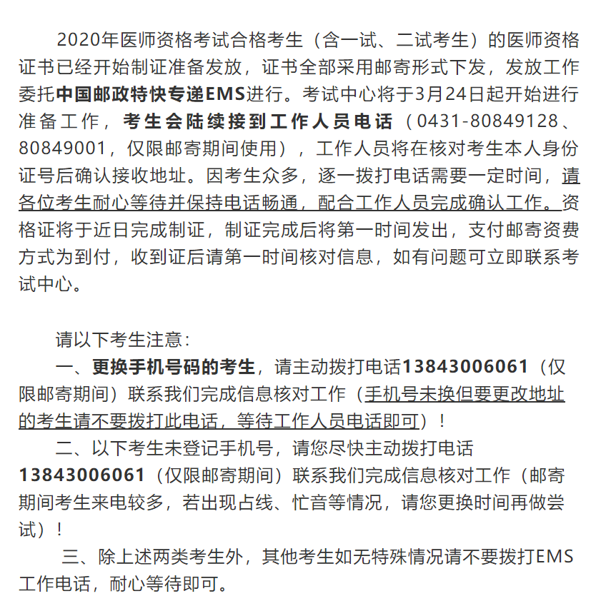 2020年醫(yī)師資格考試合格考生(含一試、二試考生)的醫(yī)師資格證書已經(jīng)開始制證準(zhǔn)備發(fā)放,證書全部采用郵寄形式下發(fā),發(fā)放工作委托中國郵政特快專遞EMS進(jìn)行。考試中心將于3月24日起開始進(jìn)行準(zhǔn)備工作,考生會陸續(xù)接到工作人員電話(0431-80849128、80849001,僅限郵寄期間使用),工作人員將在核對考生本人身份證號后確認(rèn)接收地址。因考生眾多,逐一撥打電話需要一定時間,請各位考生耐心等待并保持電話暢通,配合工作人員完成確認(rèn)工作。資格證將于近日完成制證,制證完成后將第一時間發(fā)出,支付郵寄資費方式為到付,收到證后請第一時間核對信息,如有問題可立即聯(lián)系考試中心。