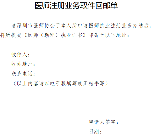 深圳市醫(yī)師協(xié)會(huì)醫(yī)師注冊(cè)業(yè)務(wù)取件回郵單(附件下載)