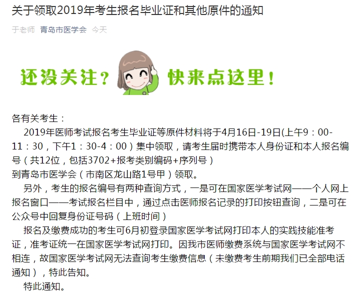 通知原文: 山東省青島市發(fā)布關(guān)于領(lǐng)取2019年醫(yī)師資格考試考生報(bào)名畢業(yè)證和其他原件的通知
