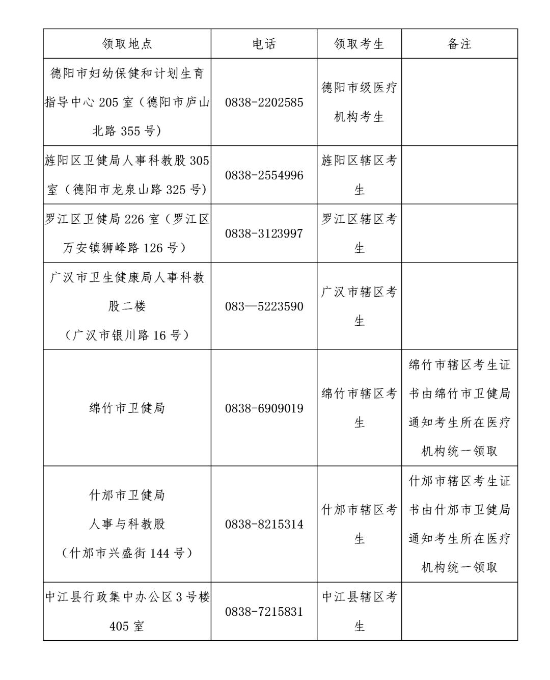 請德陽市人民醫(yī)院、德陽市第二人民醫(yī)院、成都中醫(yī)藥大學(xué)附屬醫(yī)院德陽醫(yī)院、德陽市第六人民醫(yī)院、德陽第五醫(yī)院、德陽市口腔醫(yī)院、德陽市精神衛(wèi)生中心、德陽腫瘤醫(yī)院、德陽眼科醫(yī)院、德陽市疾病預(yù)防控制中心等10家醫(yī)療機(jī)構(gòu)選派本單位職工持介紹信到德陽市婦幼保健和計劃生育指導(dǎo)中心統(tǒng)一領(lǐng)取證書,以上10家醫(yī)療衛(wèi)生機(jī)構(gòu)的考生在本單位領(lǐng)取證書。
