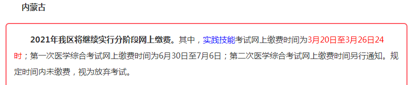 2021年我區(qū)將繼續(xù)實行分階段網(wǎng)上繳費。其中,實踐技能考試網(wǎng)上繳費時間為3月20日至3月26日24時;第一次醫(yī)學綜合考試網(wǎng)上繳費時間為6月30日至7月6日;第二次醫(yī)學綜合考試網(wǎng)上繳費時間另行通知。規(guī)定時間內(nèi)未繳費,視為放棄考試。