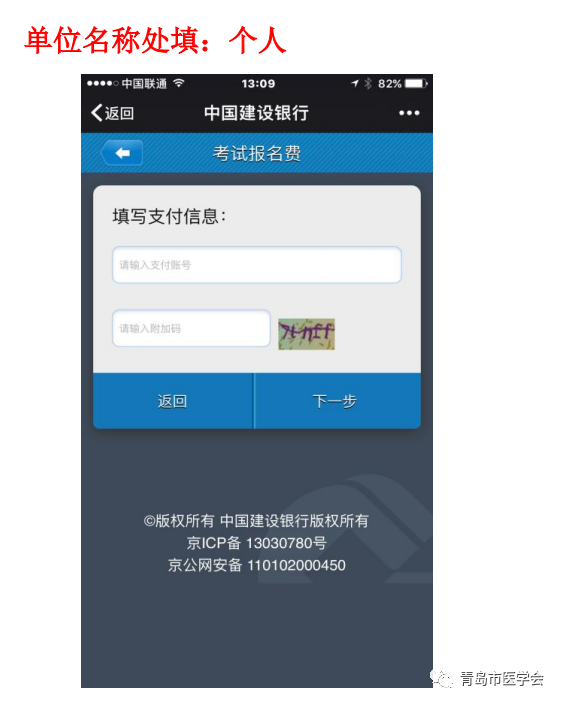 登錄建行官方網(wǎng)站悅生活平臺http://life.ccb.com,選擇“悅享生活”→“悅生活”→“應(yīng)用服務(wù)”→“教育服務(wù)”→“考試報名費”→“山東省-青島市-國家醫(yī)師資格考試費” →下一步→根據(jù)頁面提示,輸入身份證號、姓名→下一步→核對支付信息→“確認(rèn)”→輸入建行帳號等信息,完成支付。