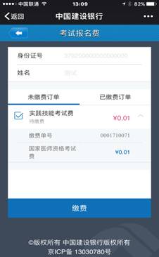 通過中國建設(shè)銀行“云平臺”繳納國家醫(yī)師資格考試費,可通過以下六種方式之一繳納(重點推薦使用:二維碼支付、微信建行支付和建行龍支付,特點:便捷、安全):1. 掃描二維碼直接繳費;2、建行微信支付,3. 建行龍支付,4. 建行手機銀行支付,5. 建行網(wǎng)站支付,6. 個人網(wǎng)上銀行支付,(注意!除建行龍支付外,僅能使用建行儲蓄卡繳費)。