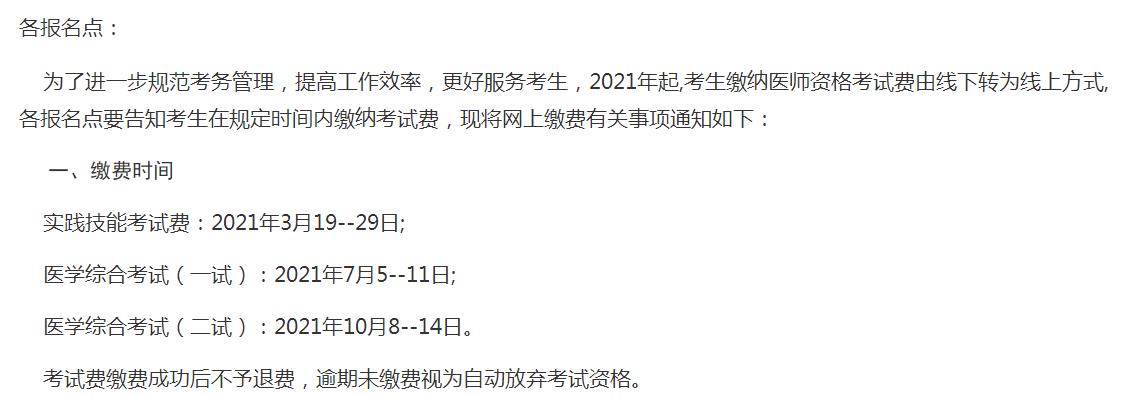 為了進(jìn)一步規(guī)范考務(wù)管理,提高工作效率,更好服務(wù)考生,2021年起,考生繳納醫(yī)師資格考試費由線下轉(zhuǎn)為線上方式,各報名點要告知考生在規(guī)定時間內(nèi)繳納考試費,現(xiàn)將網(wǎng)上繳費有關(guān)事項通知如下: