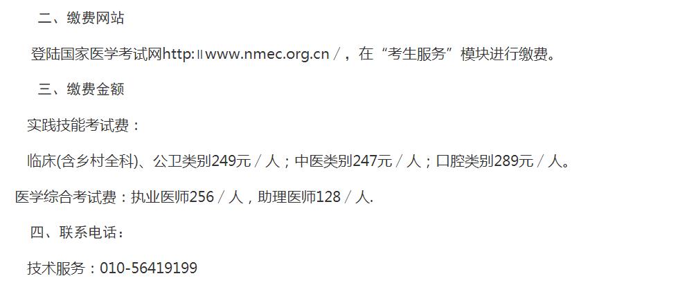 醫(yī)學(xué)綜合考試費:執(zhí)業(yè)醫(yī)師256∕人,助理醫(yī)師128∕人.