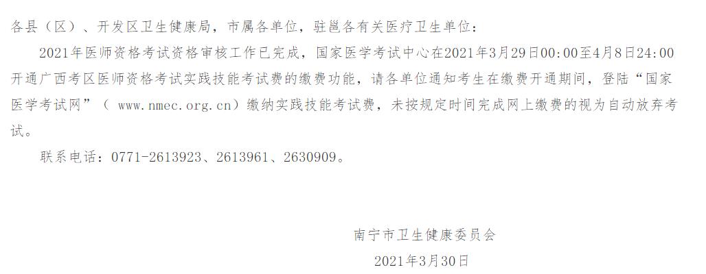 2021年醫(yī)師資格考試資格審核工作已完成,國家醫(yī)學(xué)考試中心在2021年3月29日00:00至4月8日24:00開通廣西考區(qū)醫(yī)師資格考試實(shí)踐技能考試費(fèi)的繳費(fèi)功能,請(qǐng)各單位通知考生在繳費(fèi)開通期間,登陸“國家醫(yī)學(xué)考試網(wǎng)”(www.nmec.org.cn)繳納實(shí)踐技能考試費(fèi),未按規(guī)定時(shí)間完成網(wǎng)上繳費(fèi)的視為自動(dòng)放棄考試。