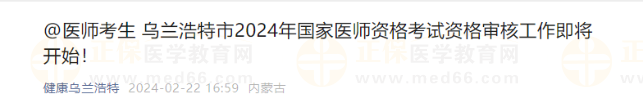 @醫(yī)師考生 烏蘭浩特市2024年國家醫(yī)師資格考試資格審核工作即將開始!