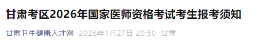 根據(jù)《國家衛(wèi)生健康委員會(huì)醫(yī)師資格考試委員會(huì)公告》(2026年第1號(hào)),依據(jù)《中華人民共和國醫(yī)師法》和《醫(yī)師資格考試暫行辦法》規(guī)定,現(xiàn)將甘肅考區(qū)2026年國家醫(yī)師資格考試考生報(bào)名有關(guān)事項(xiàng)通知如下: