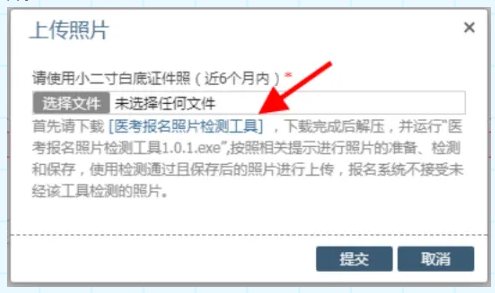 (一)考生在網(wǎng)報(bào)系統(tǒng)上傳個(gè)人小二寸白底證件照時(shí),應(yīng)按照系統(tǒng)提示內(nèi)容下載并運(yùn)行“醫(yī)考報(bào)名照片檢測(cè)工具”,網(wǎng)報(bào)系統(tǒng)只接受經(jīng)該工具檢測(cè)通過且保存后的照片。?
