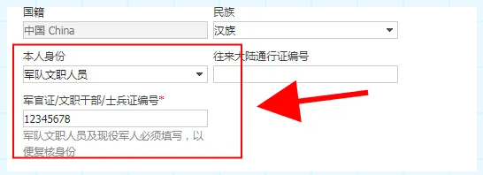 (二)現(xiàn)役軍人和部隊(duì)文職人員報(bào)名時(shí),須使用有效的居民身份證進(jìn)行申報(bào),在網(wǎng)報(bào)系統(tǒng)本人身份一欄中選擇相應(yīng)的“軍人”身份,并填寫相關(guān)的軍官證、警官證、文職干部證、士兵(官)證和軍隊(duì)學(xué)員證等證件號(hào)碼。