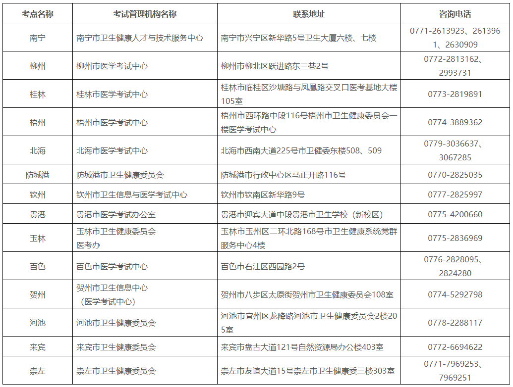 廣西壯族自治區(qū)醫(yī)學考試中心(南寧市青秀區(qū)桃源路3號),電話:0771-2618852。