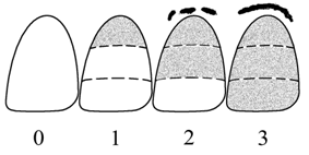 3=牙頸部菌斑覆蓋面積超過1mm,不足牙面1/3