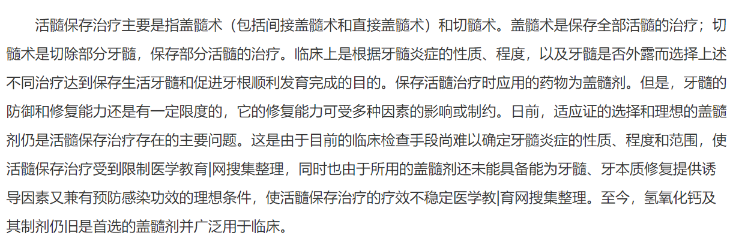 年輕恒牙牙髓組織不僅具有對(duì)牙齒的營(yíng)養(yǎng)和感覺(jué)功能,且與牙齒的發(fā)育有密切關(guān)系。牙齒萌出后,牙根的繼續(xù)發(fā)育有賴(lài)于牙髓的作用。因此,在牙髓病的治療中,保存生活牙髓應(yīng)是最有益于年輕恒牙的首選治療。治療原則是:盡力保存活髓組織,如不能保存全部活髓,也臆保存根部活髓。如不能保存根部活髓,也應(yīng)保存牙齒。
