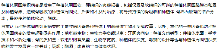 1.【答案及解析】E。治療種植體周圍組織病變的基本原則是持之以恒地徹底去除菌斑,控制感染,消除種植體周袋,制止骨喪失,誘導骨再生。