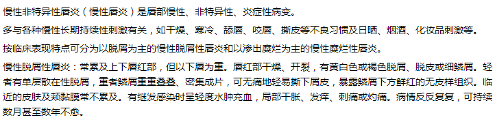 慢性糜爛性唇炎:上下唇紅部反復(fù)糜爛,滲出明顯,結(jié)痂剝脫。有炎性滲出物時(shí)會(huì)形成黃色薄痂,有出血時(shí)會(huì)形成血痂,有繼發(fā)感染時(shí)會(huì)結(jié)為膿痂。痂皮脫落后形成出血性創(chuàng)面,灼熱疼痛,或發(fā)脹發(fā)癢,患者常不自覺咬唇、舔唇或用手揉擦,以致病損部位皸裂、疼痛加重,滲出愈加明顯,繼之又結(jié)痂,造成痂上疊痂,唇紅部腫脹或慢性輕度增生,下頜下淋巴結(jié)腫大。患部可有暫時(shí)愈合,但常復(fù)發(fā)。