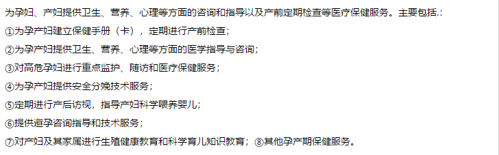 ②為孕產(chǎn)婦提供衛(wèi)生、營(yíng)養(yǎng)、心理等方面的醫(yī)學(xué)指導(dǎo)與咨詢服務(wù);